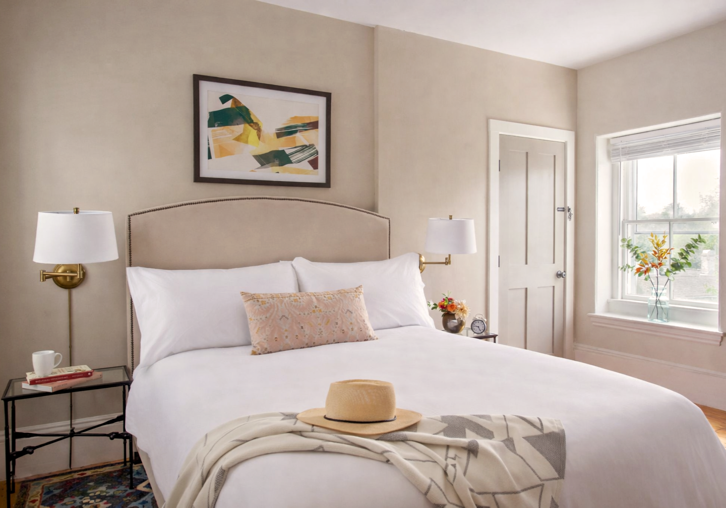 Guests are welcomed by elegant spaces that showcase the restoration of the architectural details. The living room’s lounge furniture is arranged in small vignettes that can be grouped into larger ones for the guests convenience. The dining room is designed with flexibility in mind, where guests can find breakfast in the morning, and a large communal table for dining and remote working. The curated artwork throughout the spaces complement the color palettes of the fabrics and decorative accents.
